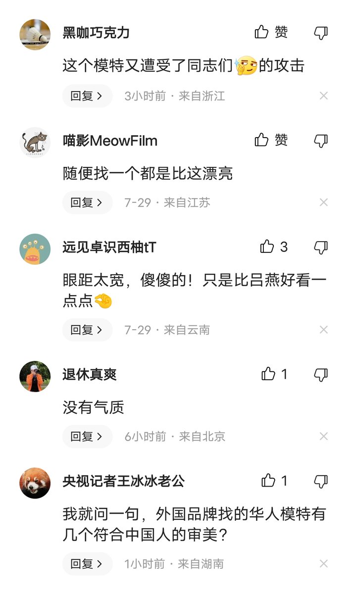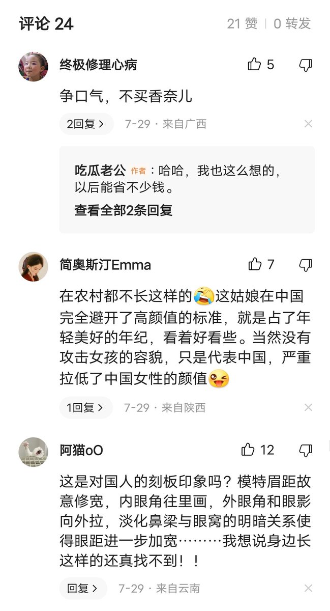 香奈儿也被指辱华了。这次模特的眼睛不算小吧,评论区却说模特“拉低了中国女性的颜值”,这算不算是在贬低他人的相貌?