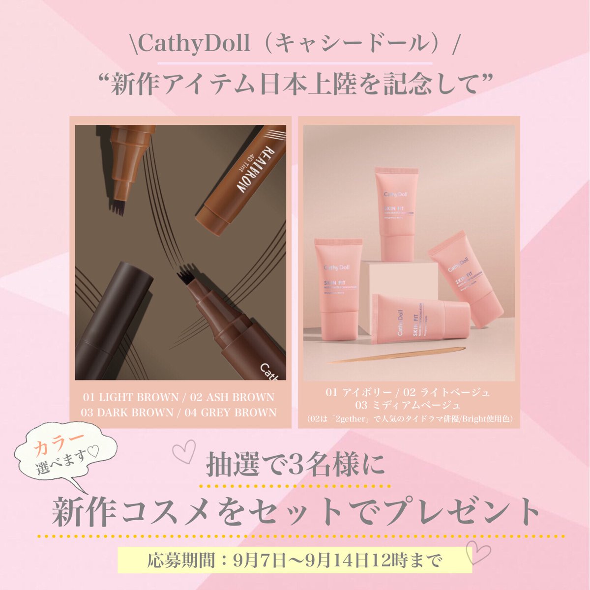 タイコスメ「CathyDoll(キャシードール)」に新作登場❣新作アイブロウ2種、ミニファンデは9/14(火)19時より予約販売スタート✨販売を記念して5名様にプレゼント🎁
