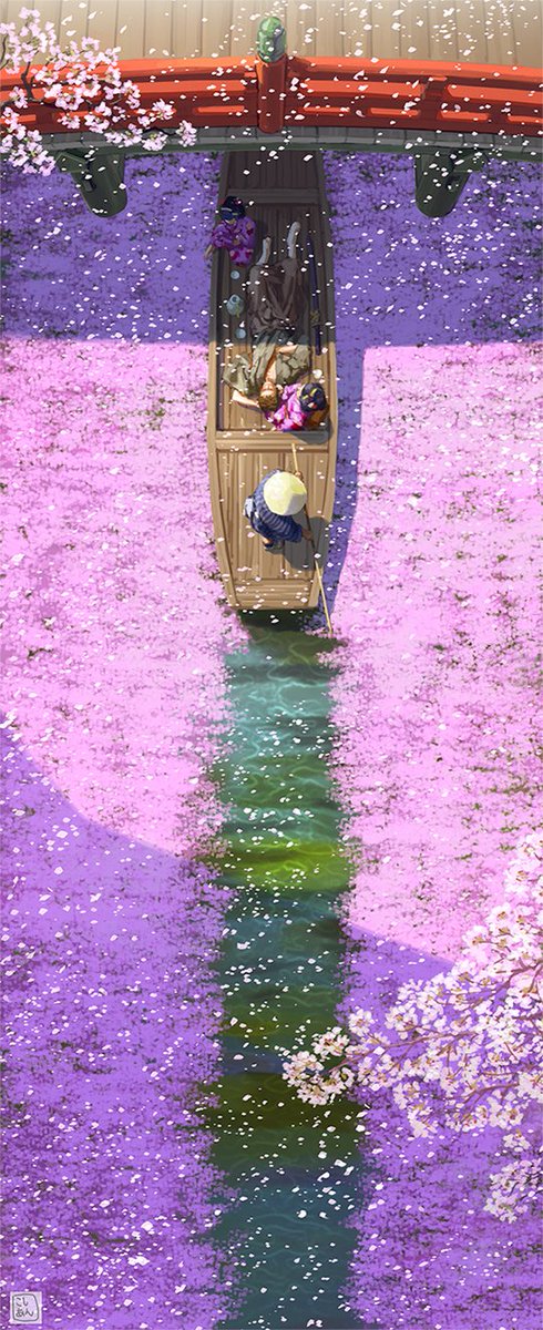 「桜散る川」
