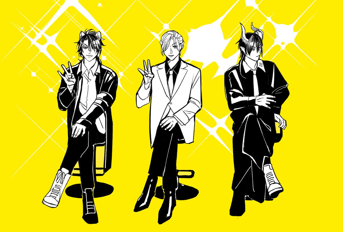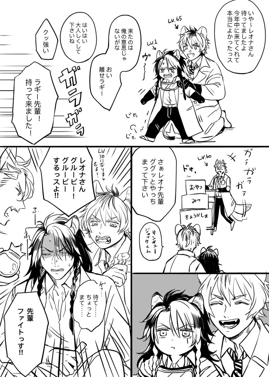 実験着レオナくんやっと来たので描き納めになんとか描きました(はぁはぁ)🦁が自分達よりレベルが低いのが解釈違いで厳しくなる🍩と🐺