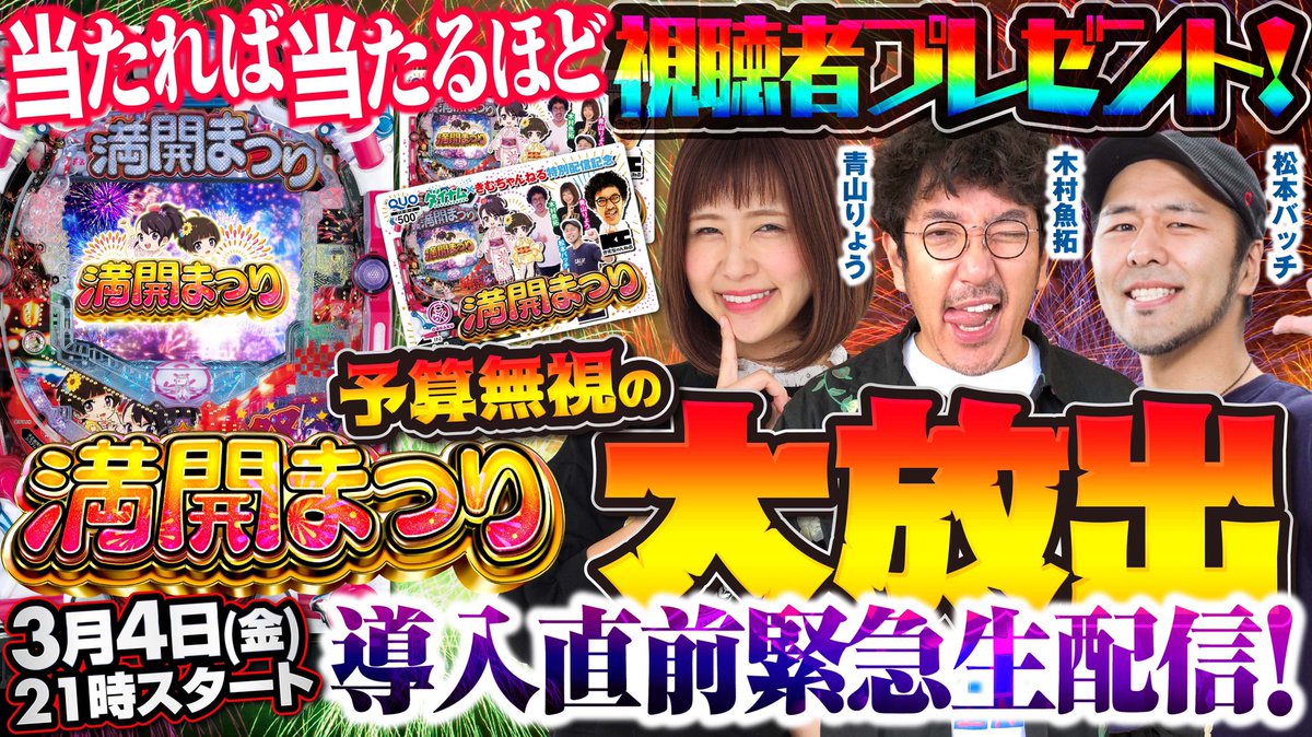 現在配信中の「P満開まつりGO導入直前生配信」では大当りを引くたびに特性QUOカードをプレゼント!