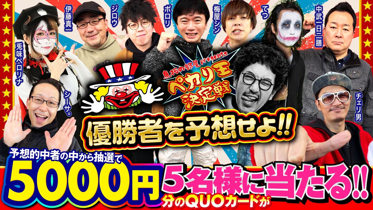 応募方法は優勝者を予想の上、この投稿を引用リツイートするだけ。「#魚拓の部屋SPペカり王決定戦」のハッシュタグも忘れずに。