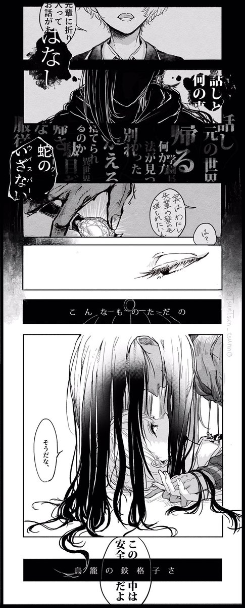 -かみ の かご(ジャミ監/🐍🌸) どうしようもなく無邪気で、残酷で、愚かで、愛おしい小鳥はずっと何も知らないままで (付き合っている、もしくは、距離感とか諸々狂っている両片思い、の2人) ※顔あり監督生♀ ※監=ユウ ※喋る
