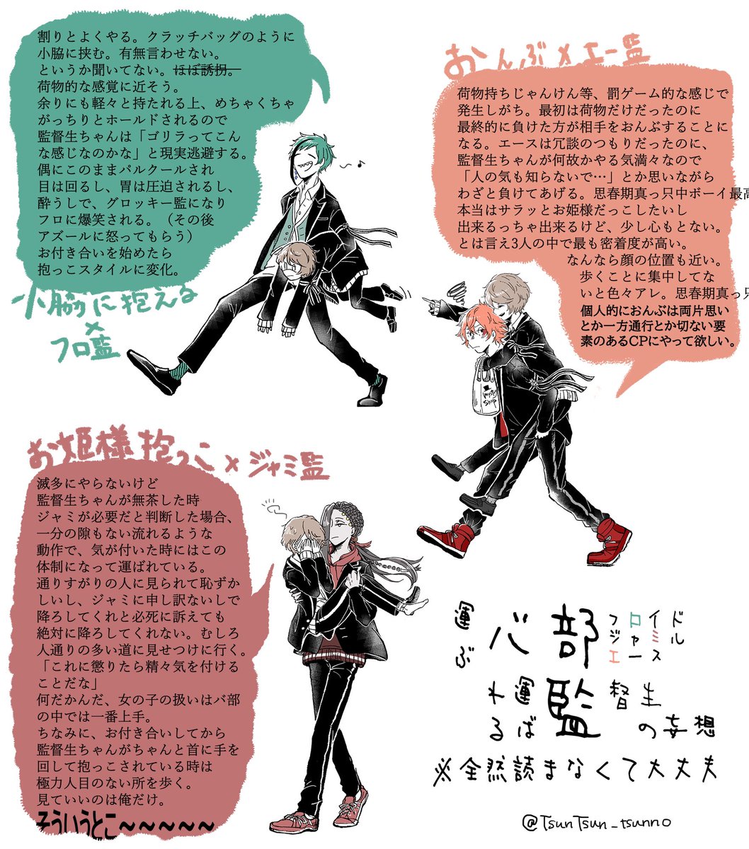 運び運ばれバ部と監 (フロ監ジャミ監エー監/🦈🌸🐍🌸♥️🌸) こうやって運搬して欲しいなぁってラクガキしてたら楽しくなったのでまとめてみた。 全部付き合ってはない。 そして4枚目は本当にただの妄想文です。 ※顔あり監督生♀