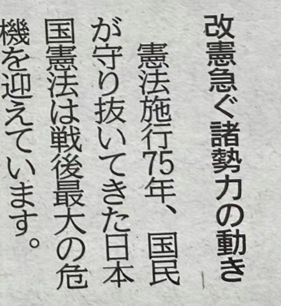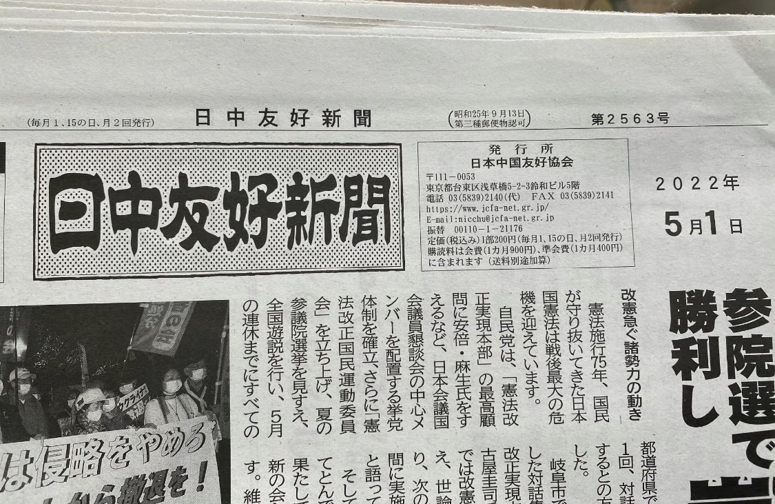 日中友好新聞(発行:日中友好協会)5月1日号の記事によると、日中友好協会は改憲を戦後最大の危機と捉えているらしいです。