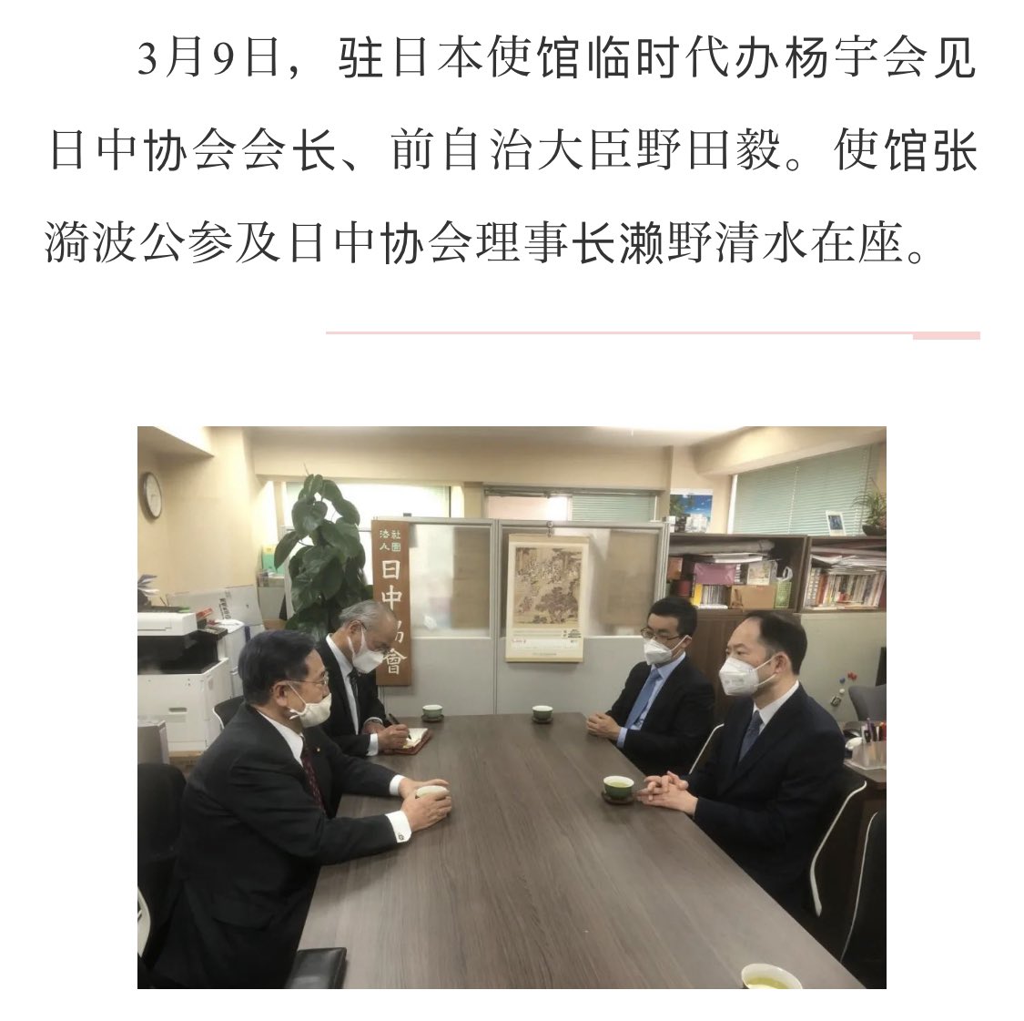 3月10日に日本国大連領事事務所の等々力所長が、中国共産党大連教育局鞠振伟局長の元へ訪問し、今年の日中国交正常化50周年を機に教育局との交流を強化し文化.スポーツ,青少年のの交流を推進していきます。