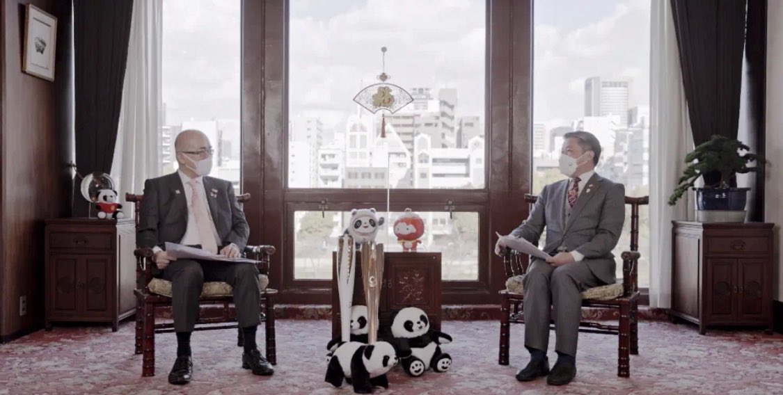 2月4日大阪観光局溝畑理事長と中国領事館の薛剑総領事が共にはしゃぐ。