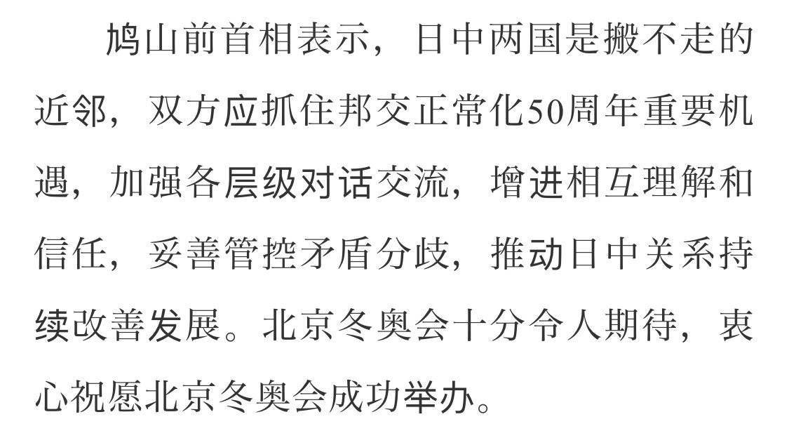 「今回の北京冬季オリンピックは必ずや大成功をおさめる事と思いますので、本当にこの度はおめでとうございます。楽しみにしております」