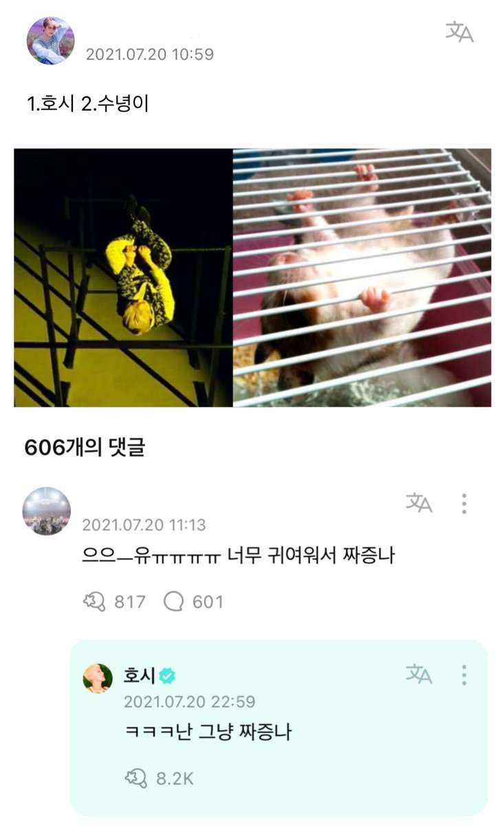 침착맨 방송에 나온 우지 위버스와 그 글에 댓글 단 침착맨 그리고 답댓글을 다는 우지 < 아 ㅈㄴ웃기다 ㅋㅋㅋㅋㅋ ㅜㅜㅜ twitter.com/i/web/status/1…
