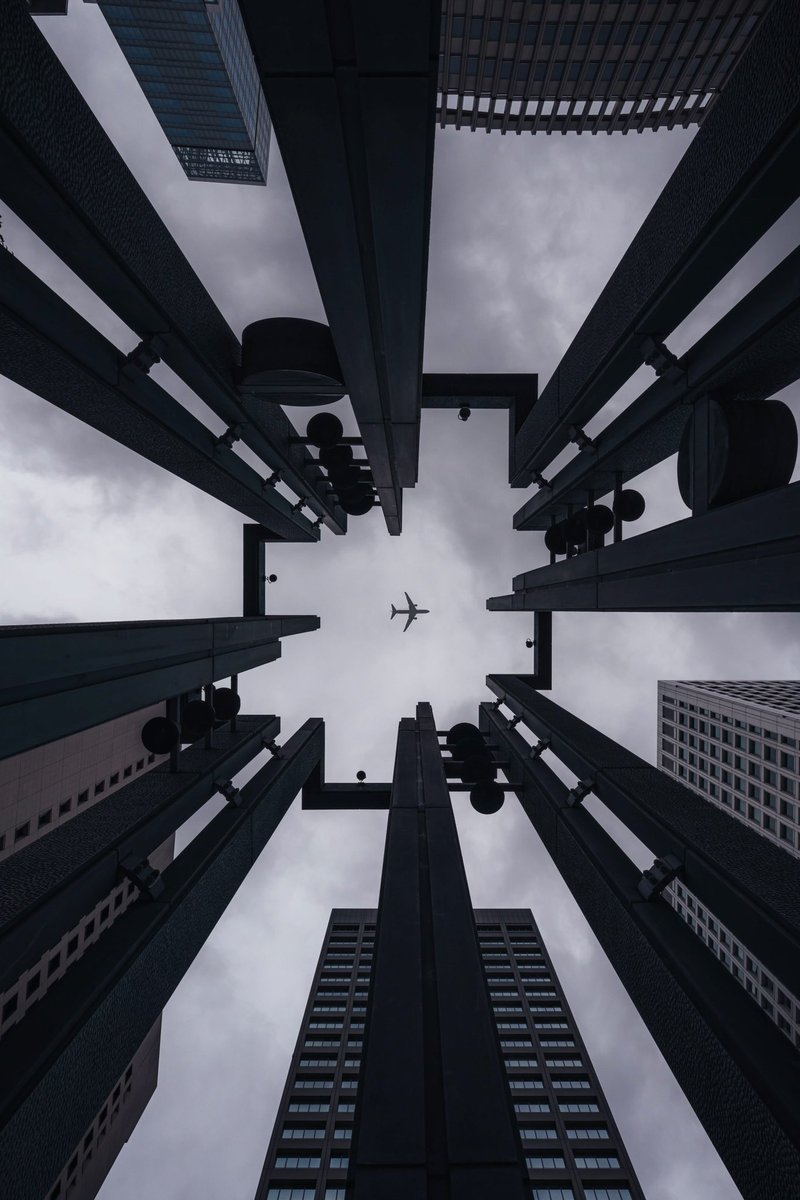 超広角で見上げる都会の空