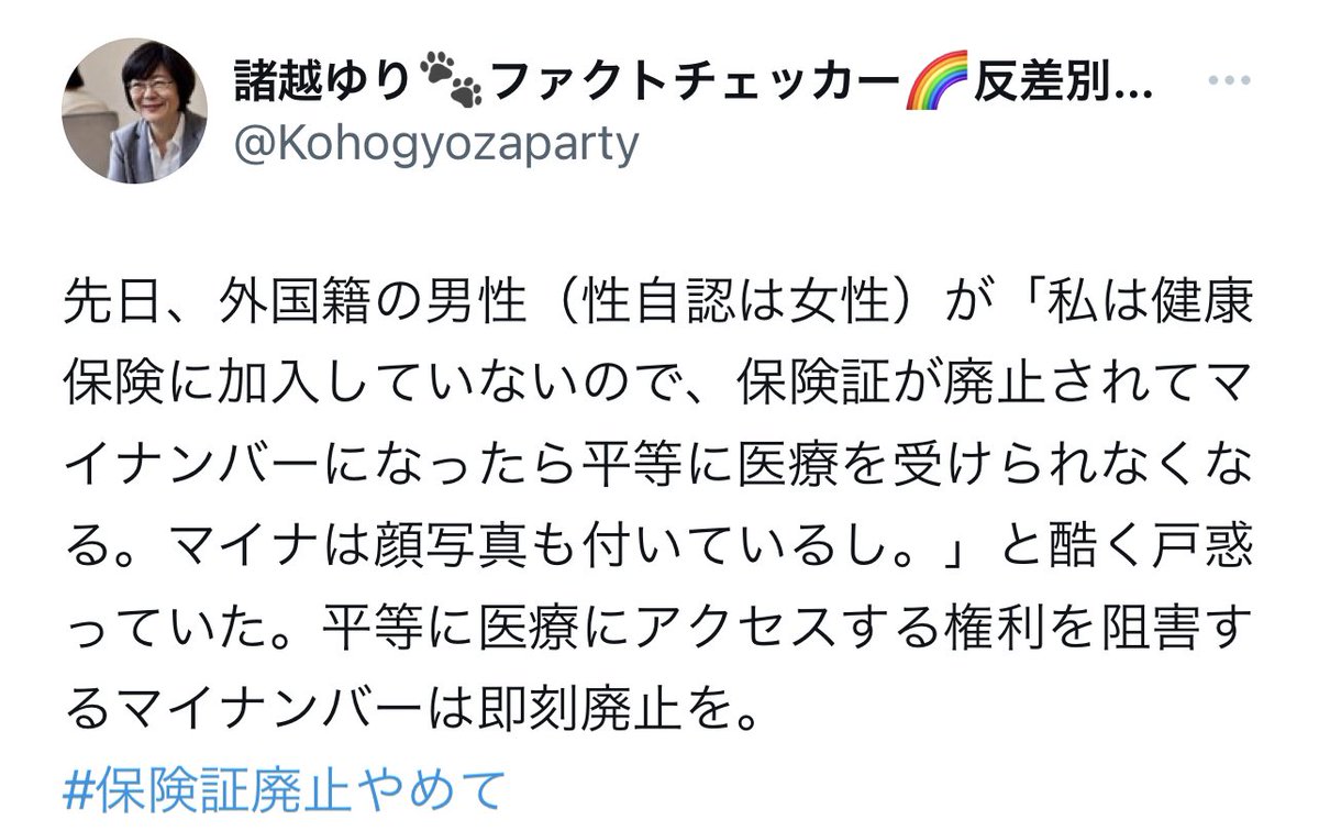 「私は健康保険に加入していないので、保険証が廃止されてマイナンバーになったら平等に医療を受けられなくなる。マイナは顔写真も付いているし。」