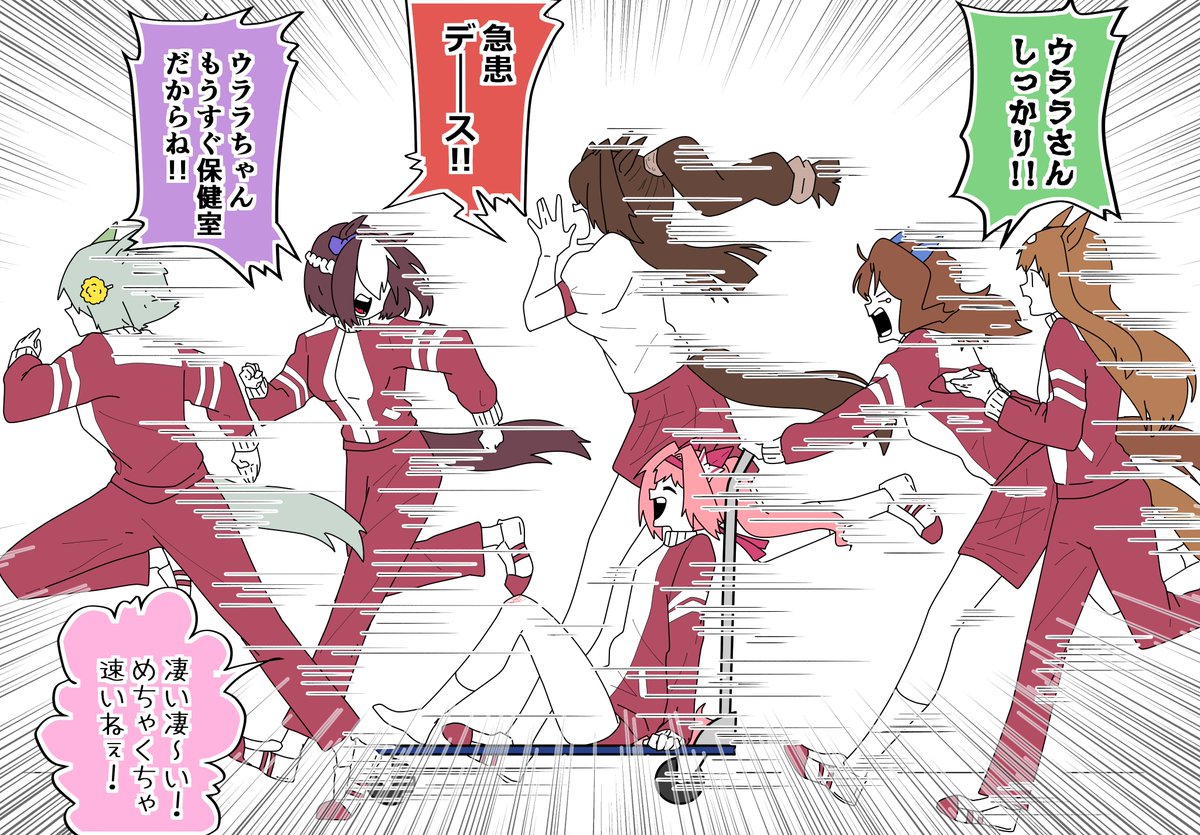 体育の授業中に転んだウララちゃんを保健室に運ぶ同期組。