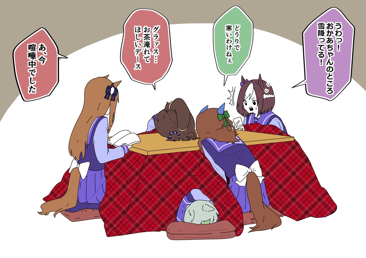 放課後にこたつで雑談する同期組。