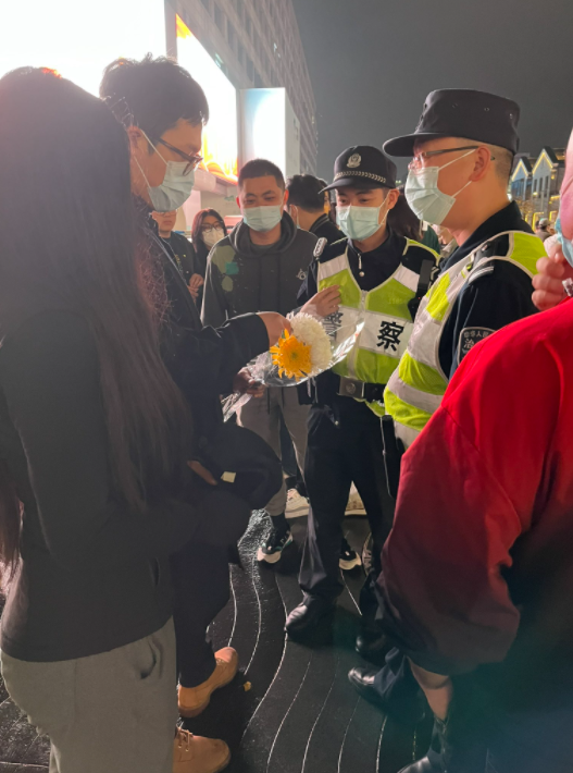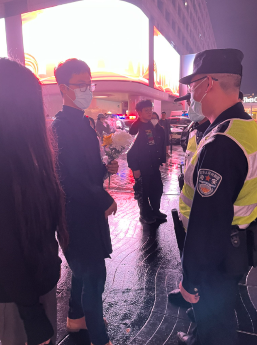 有警察在盘问路过带着鲜花的行人 还在搜查她的手机。