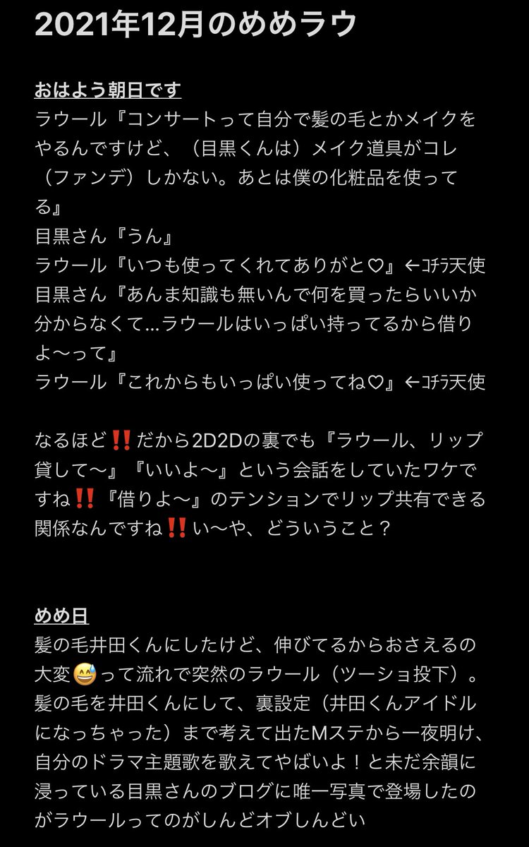 いわめめの香水作りを見て、以前"目黒蓮のココが推せる!"で『すごくセクシーな香りがしそうなイメージじゃない?でもああ見えて無臭なの。香水もつけてないみたいだし逆に男くささもない。たま〜に直前に飲んでたコーヒーのニオイがするくらい』と答えていたラウールを思い出したので残しときます