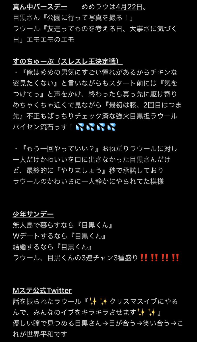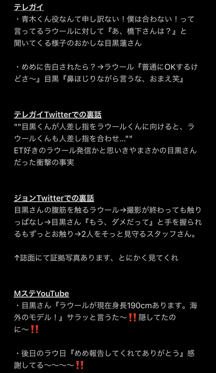 目黒蓮『当然好きな子は守ってあげたいと思うし、守るのは俺の役目でありたい。相思相愛なら俺がピンチの時はきっと女の子が精神的に守ってくれると思うんだ。そういう人は守ってあげたいと思う。あと、ラウールは守ってあげたい(笑)』←これぞ突然のラウールオブザイヤー優勝