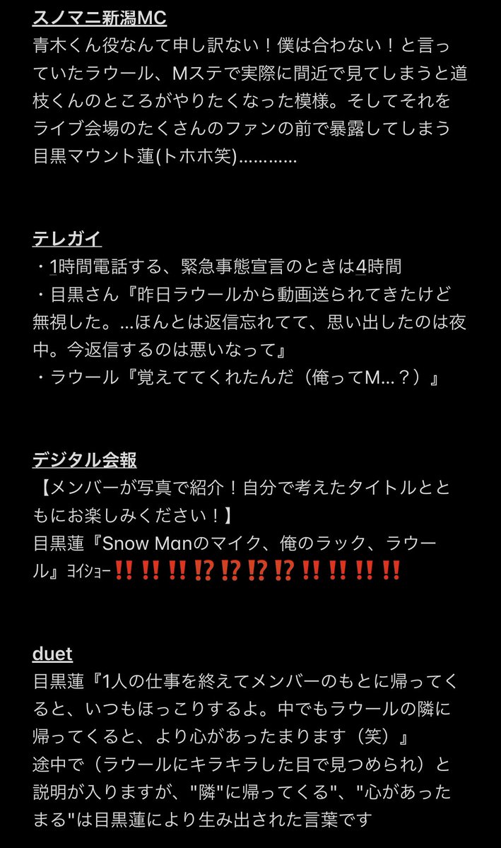 目黒蓮『1人の仕事を終えてメンバーのもとに帰ってくると、いつもほっこりするよ。中でもラウールの隣に帰ってくると、より心があったまります(笑)』これ途中で(ラウールにキラキラした目で見つめられ)って説明入るけど、"隣"に帰ってくる""心があったまる"は目黒蓮により生み出された言葉ってわけ
