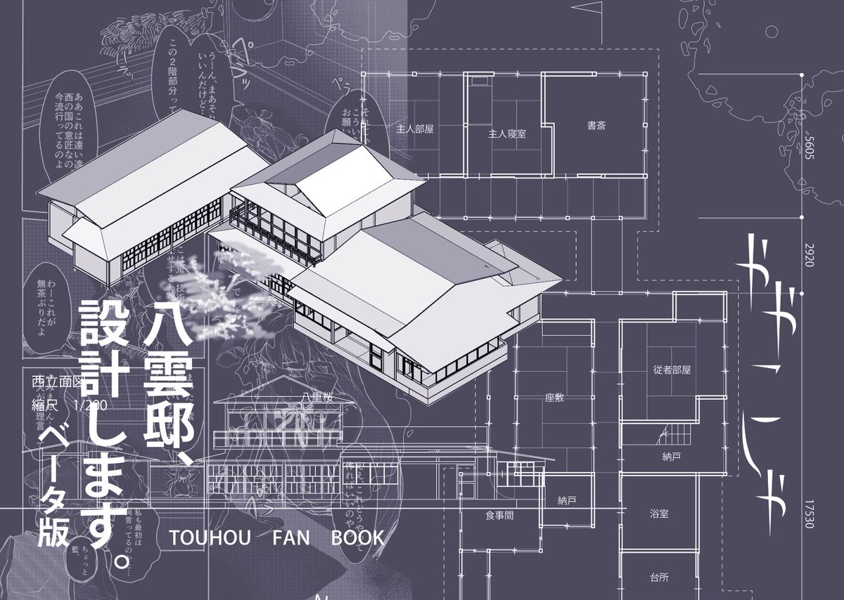 例大祭新刊情報です、以前お伝えした「東方×建築」がメインとなる八雲邸設計本、全32Pを「き19a」にて頒布いたします。内容は基本設計図面,漫画10p,文章もそこそこ多め。 しかしイラストであったり、設計も不十分が多い状態なため今回はベータ版ですがもし面白そうだと思った方は是非お越しください!