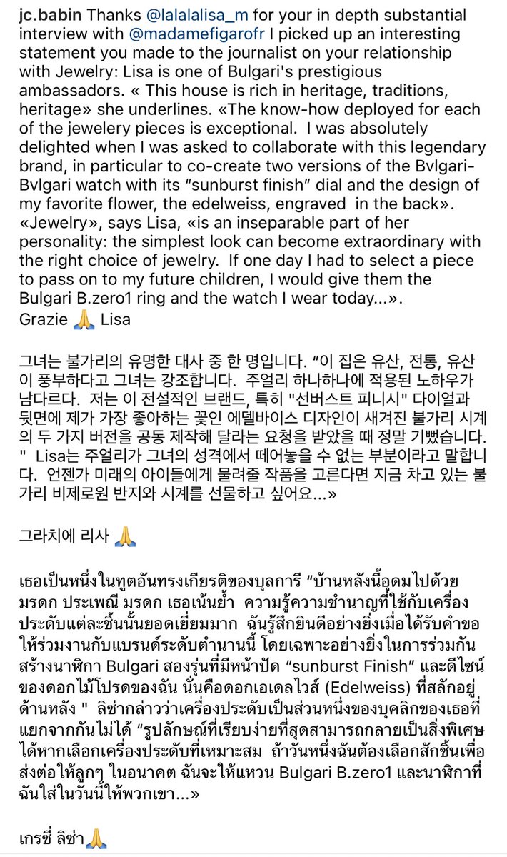 คุณ jc.Babin - CEO @Bulgariofficial โพสในส่วนของบทสัมภาษณ์ของ #LISA กับ @Madamefigaro มีทั้ง 3 ภาษา อังกฤษ เกาหลี ไทย จะมี CEO ไหนใส่ใจละเอียดอ่อนเท่าคุณ Babinไม่มีอีกแล้ว เซอร์วิส FC สุด ไปไลค์ใน ig ให้คุณลุงใจดีหน่อยค่ะ
