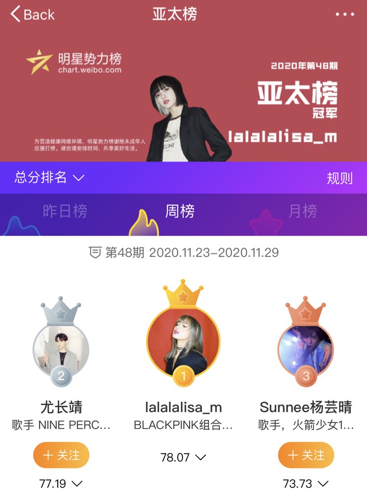 [🏅]สัปดาห์ที่ผ่านมา #LISA ได้ อันดับ 1 นะคะ ของ Weibo Superstar Power Ranking(ภูมิภาคเอเชียแปซิฟิก)