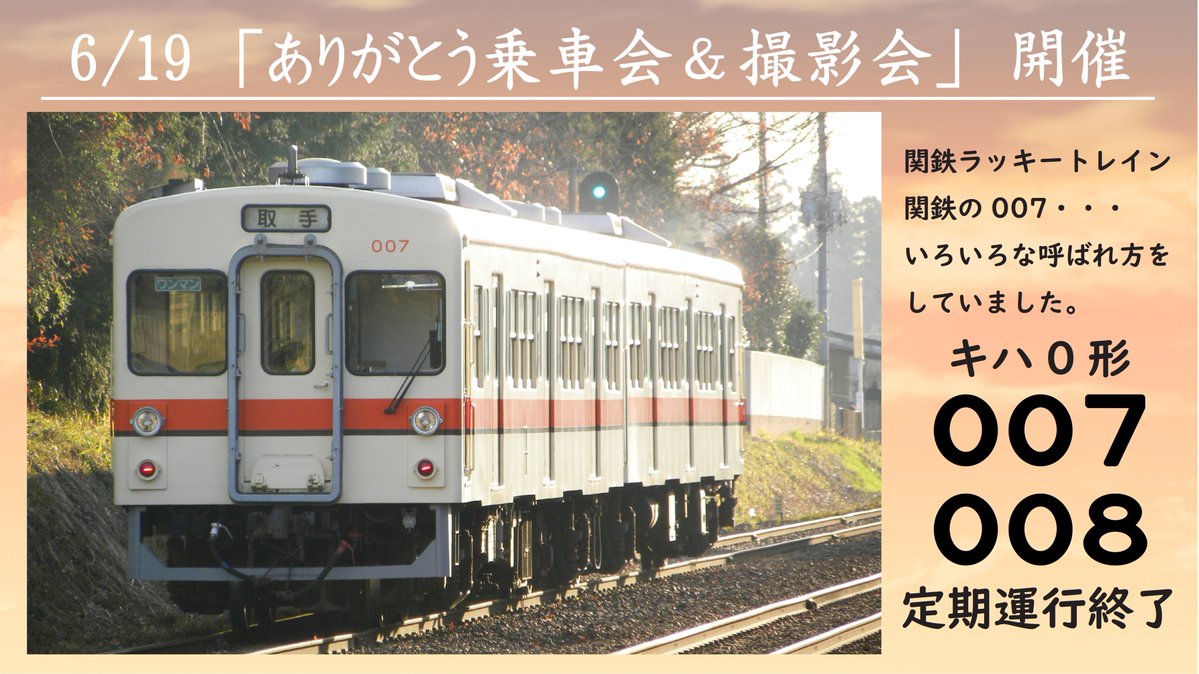 関鉄の007🔫こと、キハ0形007‐008号が定期運行を終了することになりました😢それに伴い、6/19「ありがとう乗車会&撮影会」を開催します💪‼️何が飛び出すか関鉄流サプライズ😎5/31より申込開始です💡エモい通勤型気動車をその目に‼️‼️詳しくはコチラ☝️kantetsu.co.jp/kankan/news/ev…