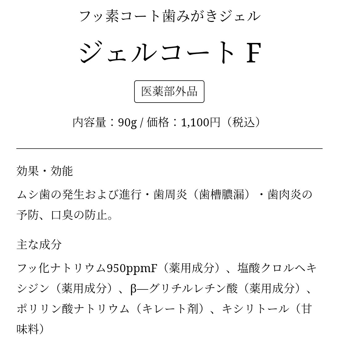 ・フッ化物濃度が950ppmであるため、現在市販されている1450ppmの歯磨剤と比較するとむし歯予防効果は6%程度低い