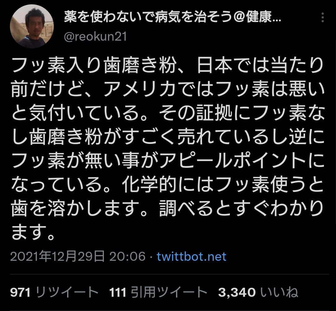 世界中で使用されているフッ化物配合歯磨剤が本当に脳の下垂体を固まらせるのであれば、人類は既に滅亡しているでしょう。 twitter.com/ageless_health…
