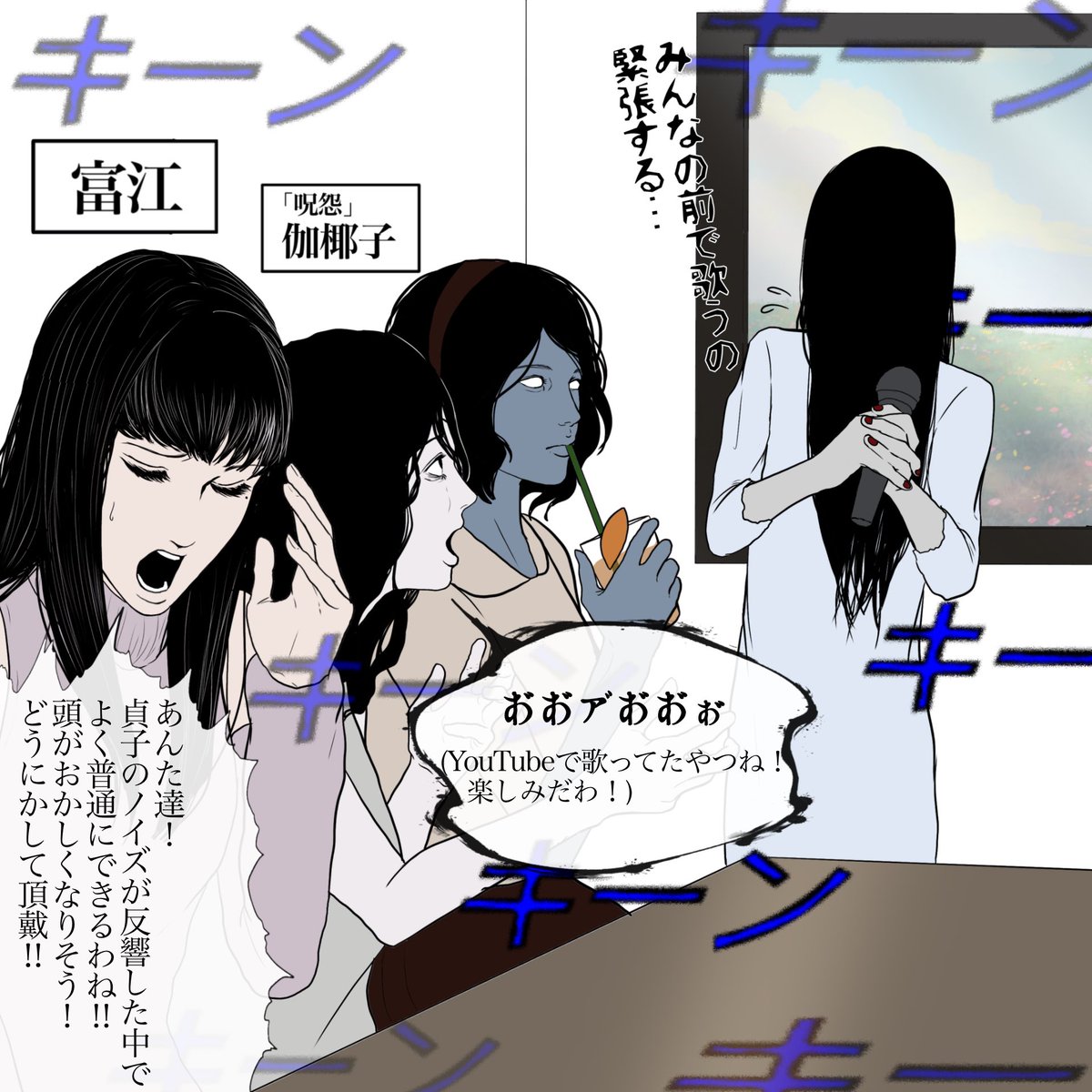 カラオケに来た貞子、凜、伽椰子、富江