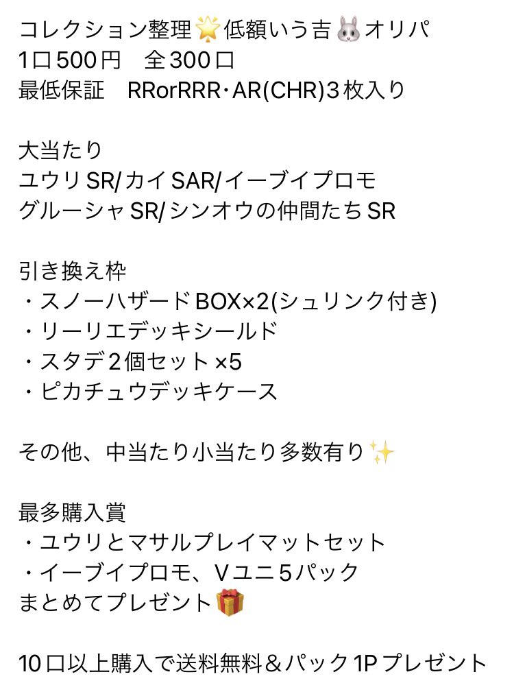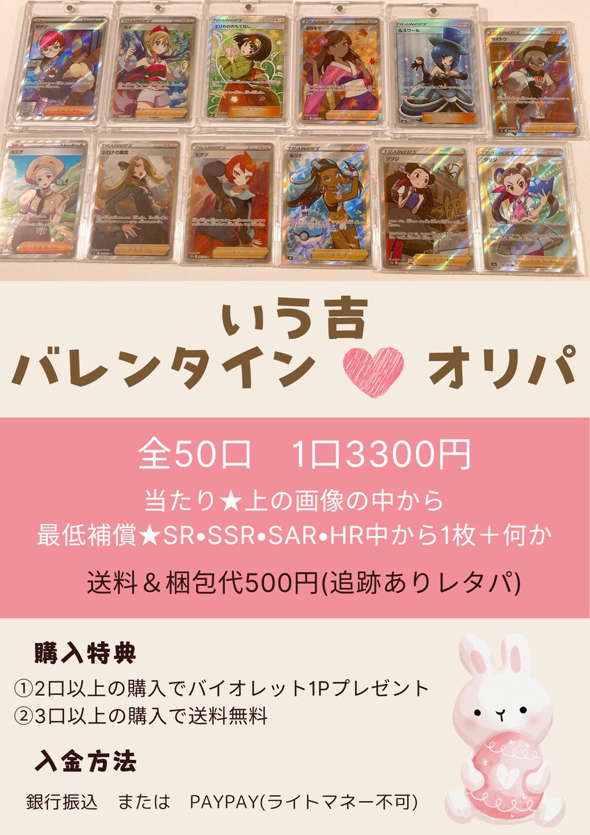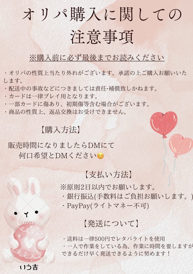 コレクション整理に500円オリパします🐰💗明日25日19時〜販売🌟1口3枚入り✨全300口をシャッフルし、購入してくださった方順に発送作業行います✨当たり枠や引き換え枠を引いた方は必ずいう吉に報告DMをお願いします🔥☺️(完売後に当たり報告のDMを掲載させていただきますのでご理解下さい)