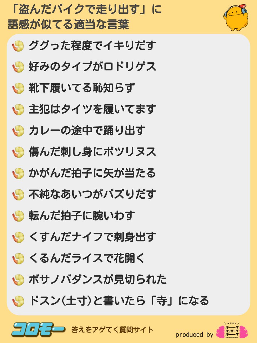 みんながアゲてくれた「盗んだバイクで走り出す」に語感が似てる適当な言葉