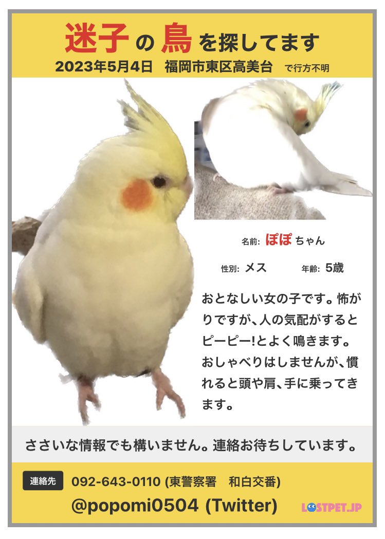 【迷子のオカメインコを探しています】 2023年5月4日 午前10時頃 福岡県福岡市東区高美台、和白東、新宮、古賀方面 保護されている方がいましたらご連絡宜しくお願いします。 東警察署 和白交番⇒(092)-643-0110