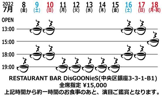 演目は土日昼回 15時/全日程夜回 19時半を目安に