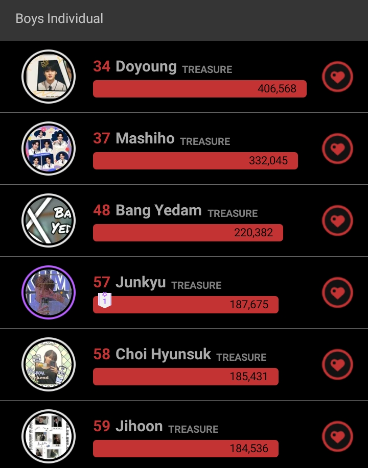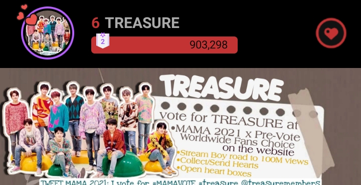We did well, Teumes! Let's keep up the good work & be consistent. Make sure to collect 2k - 3k EVER HEARTS daily for the upcoming award show votings. All for Treasure! ❤️