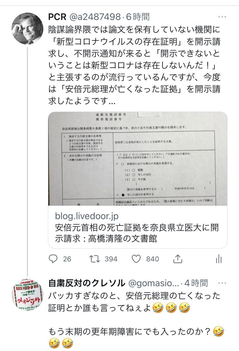 陰謀論界隈では論文を保有していない機関に「新型コロナウイルスの存在証明」を開示請求し、不開示通知が来ると「開示できないということは新型コロナは存在しないんだ!」と主張するのが流行っているんですが、今度は「安倍元総理が亡くなった証拠」を開示請求したようです…