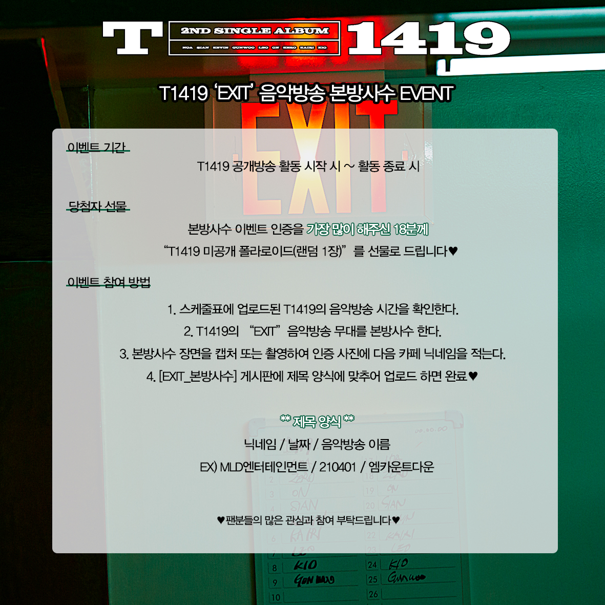 팬분들을 위한 'EXIT' 음악방송 본방사수 이벤트가 진행됩니다!