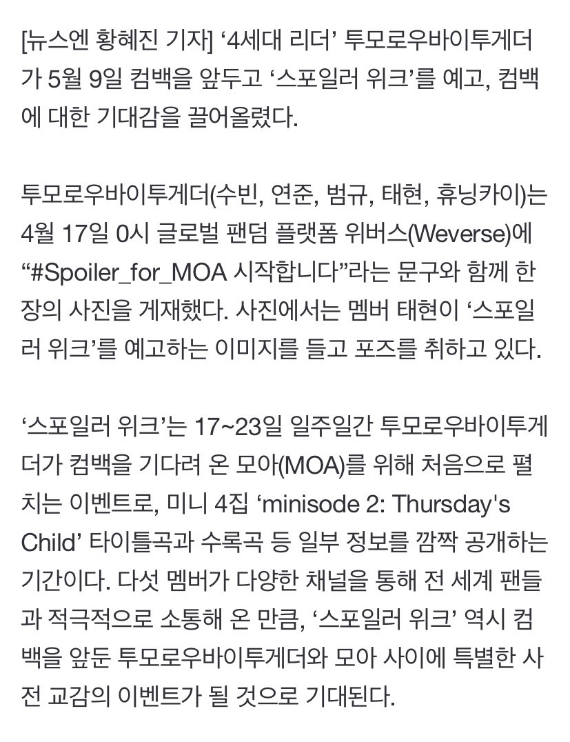 ‘스포일러 위크’는 ‘minisode 2: Thursday's Child’ 타이틀곡과 수록곡 등 일부 정보를 깜짝 공개하는 기간이다. 투모로우바이투게더와 모아 사이에 특별한 사전 교감의 이벤트가 될 것으로 기대된다.