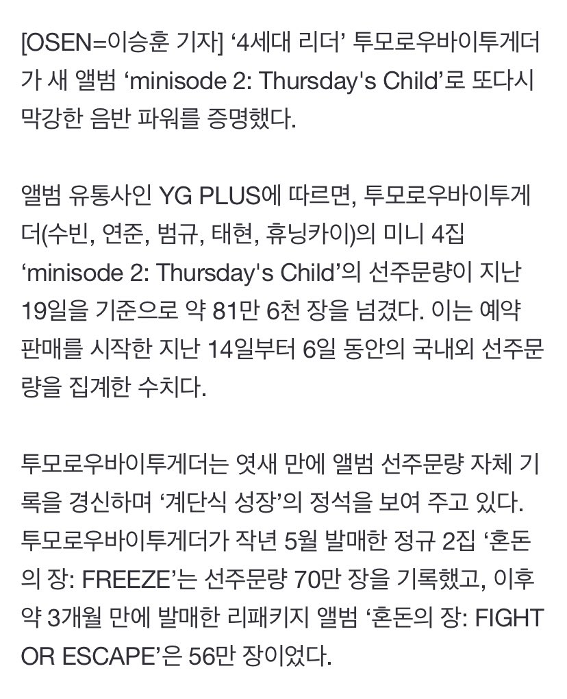 투모로우바이투게더, 6일만 신보 선주문 81만장 돌파..˙4세대 리더˙ 자리매김 [공식] naver.me/GTOHEpc6