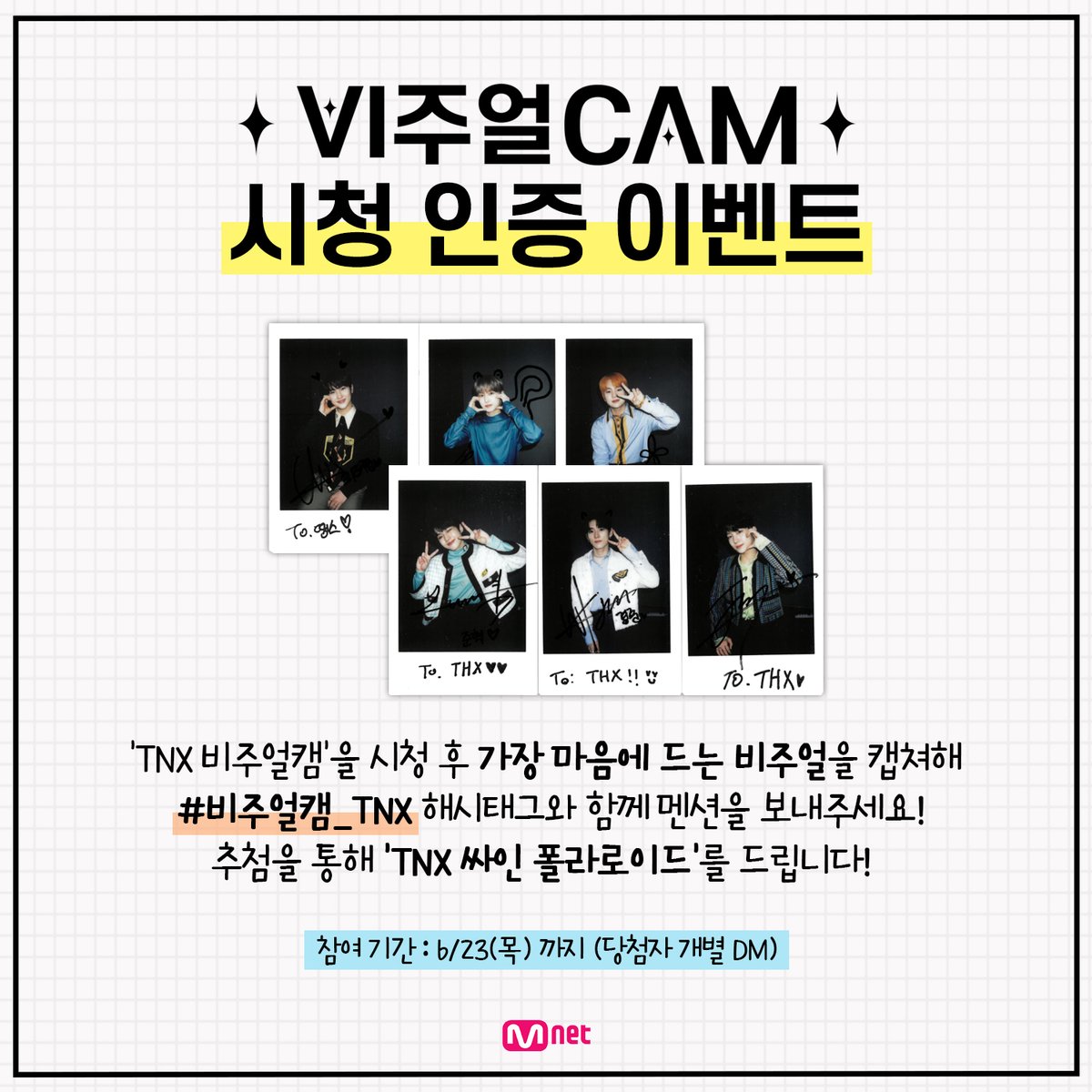 ‘TNX 비주얼캠'을 시청 후 가장 마음에 드는 비주얼을 캡쳐해 <#비주얼캠_TNX> 해시태그와 함께 멘션을 보내주세요! 추첨을 통해 ‘TNX 싸인 폴라로이드'를 드립니다! (~6/23(목)까지, 당첨자 개별 DM)