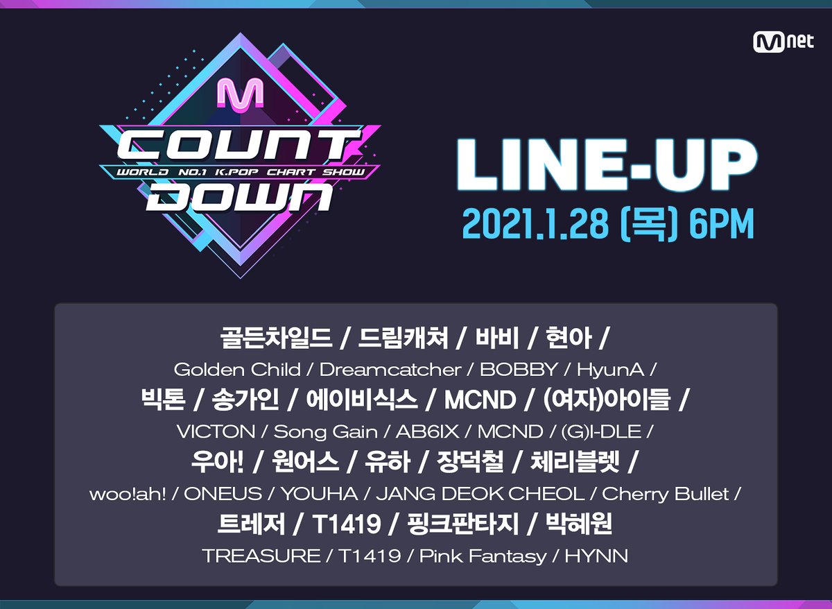 골든차일드/드림캐쳐/BOBBY/VICTON(빅톤)/송가인/AB6IX/MCND/(여자)아이들/woo!ah!(우아!)/원어스(ONEUS)/YOUHA(유하)/장덕철/체리블렛(Cherry Bullet)/TREASURE(트레저)/T1419/핑크판타지/현아/HYNN(박혜원)