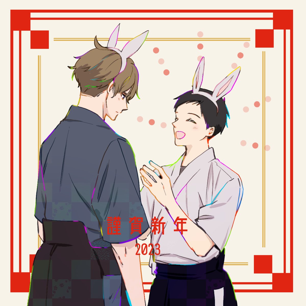 あけましておめでとうございます🎍 大変不服だけど湊のウサミミと笑顔が見れたので許す愁くん 2023年は愁湊と愁湊ファンの皆様が幸せいっぱいになりますように!🟣🟢