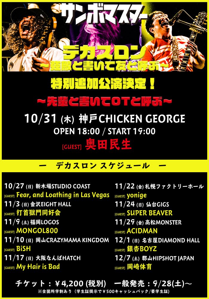 10/31(木)神戸CHICKEN GEORGEで開催され、ゲストにはまさかの奥田民生さんが出演することが決定!