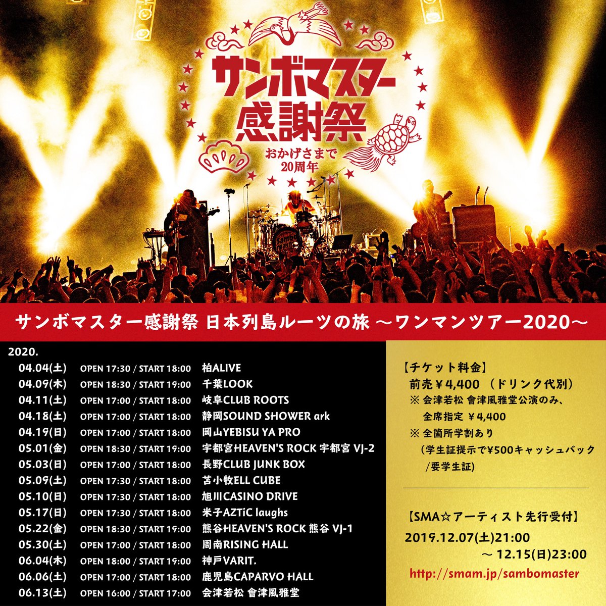 来年はサンボマスター結成20周年!20年間支えてくれた皆様に【サンボマスター感謝祭】と称し、感謝をお伝えします!第一弾として、約2年ぶりのワンマンツアー【日本列島ルーツの旅~ワンマンツアー2020~】を開催!作品リリースも年明け発表!?乞うご期待下さい‼