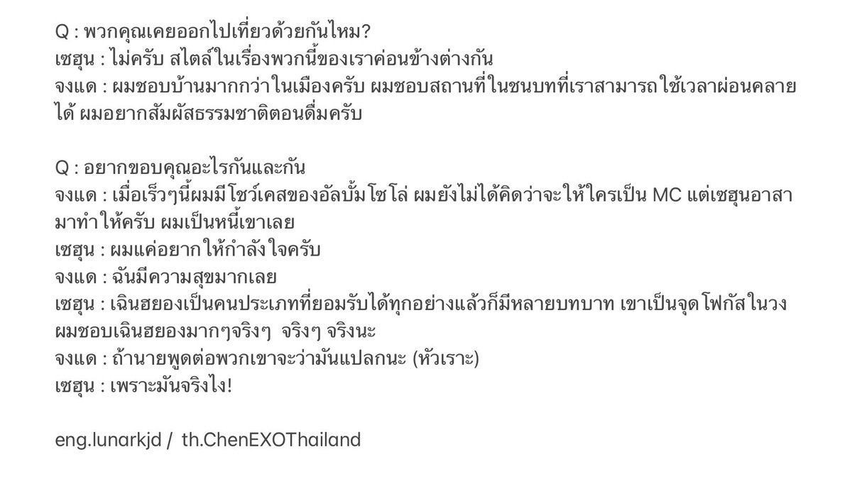 จงแด : ซูโฮฮยองครับ ผมอายุเท่าแบคฮยอน ชานยอลและดีโอ ดังนั้นผมเลยคุยกับพวกเขาไม่ค่อยได้ (หัวเราะ) ผมไม่ได้คุยเรื่องนี้กับเซฮุนและไค แล้วซูโฮฮยองก็เป็นพี่ใหญ่ด้วย