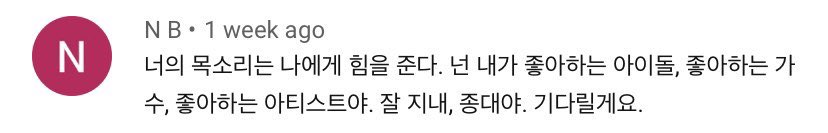 - ฉันมานี่เพราะอยากฟังเสียงของคุณ ถึงคุณจะเป็นนักร้องของฉันแต่ฉันก็ยังสงสัยว่าคุณร้องได้ดีขนาดนี้ได้ยังไงกัน ㅠㅠ หวังว่าจะใช้ชีวิตอย่างดีนะ คิดถึงมากๆเลย จงแดของพวกเรา