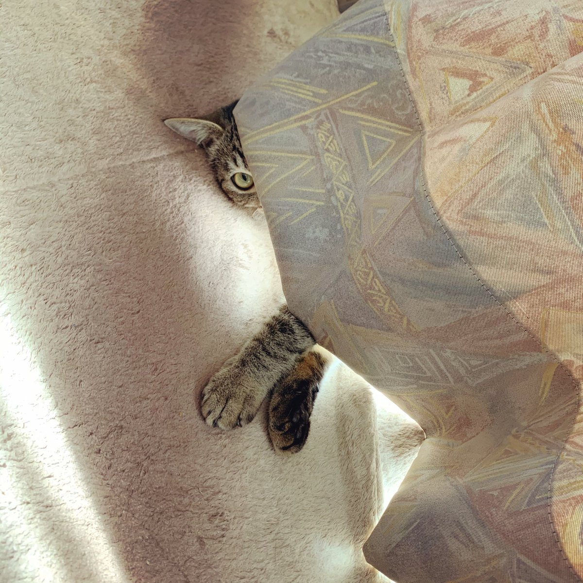 コタツの中が熱くなってくるとこのように上半身を出して寝てます 頭だけ出してたり、脚だけニョキっと出てる日もあります