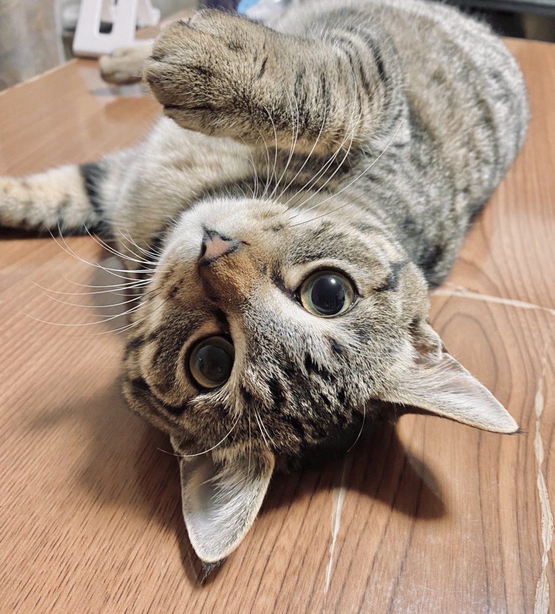 かまってほしくて机の上でゴロンゴロンするねこ