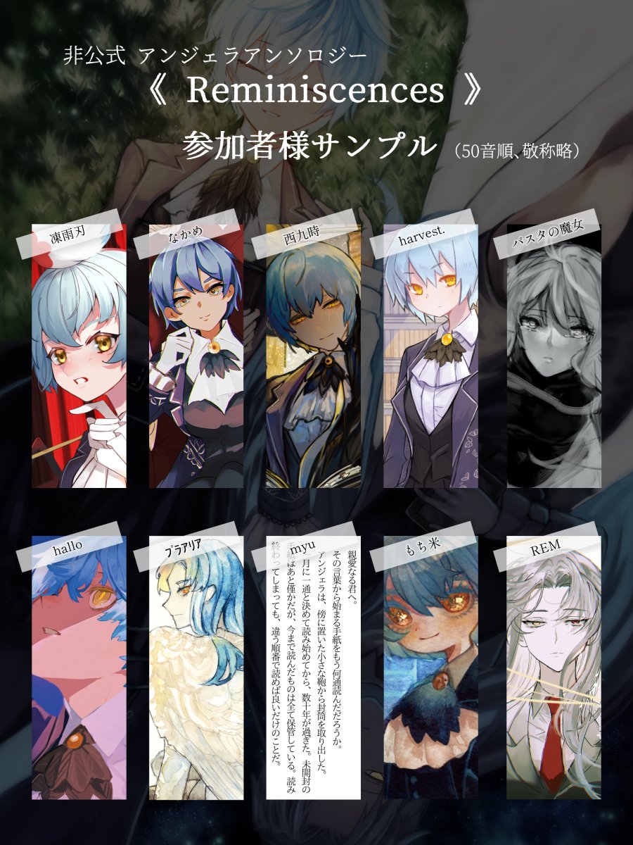 【告知】アンジェラアンソロジー《Reminiscences》の表紙、及び参加者様のお名前とサンプルを公開いたします!アンソロジーは5/29開催のプロムンオンラインオンリー「ダズムン3」に配布予定です。 仕様:A5/66P/価格未定