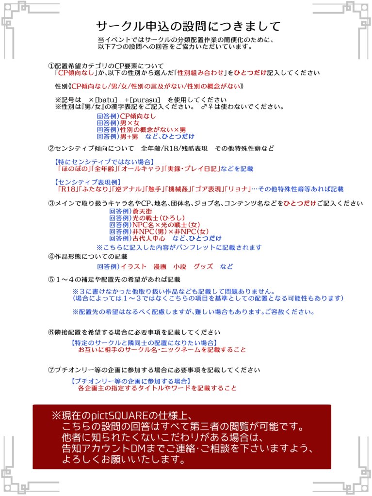 来週12月27日20:00の申込スタートに先がけ、サークル参加申込の際の表記のお願いと設問の解説の画像をご用意しました!