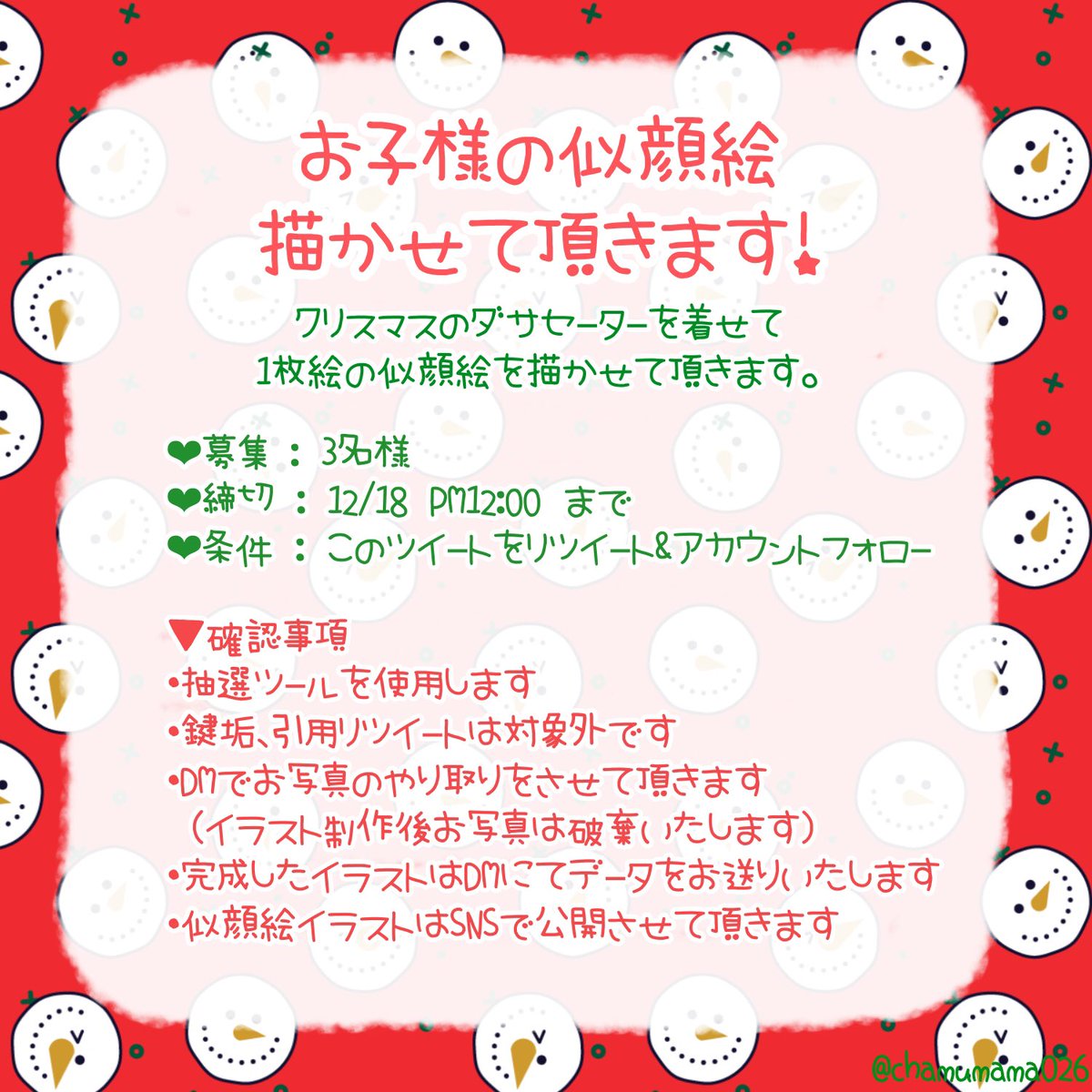 ✏️年内最後の似顔絵企画! クリスマスのダサセーターを着せたお子様の似顔絵を描かせてください〜!前回の似顔絵企画で描かせて頂いた丑モチーフのようなデフォルメで描こうかなと思っています(*´◒`*)よろしくお願いします!