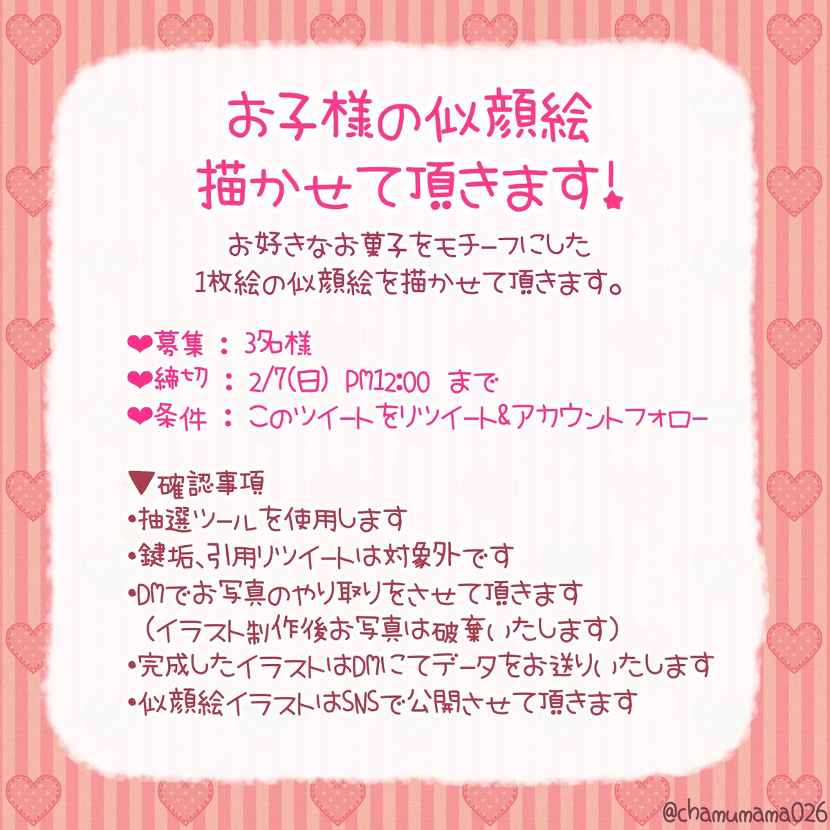 ✏️バレンタインの似顔絵企画! 好きなお菓子をモチーフにしたお子様の似顔絵を描かせてください〜!今回は2〜3枚目みたいなチョークアート?風に描いてみようと思います!(*´◒`*)よろしくお願いします!